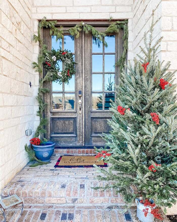 Old double doors deserve quiet treatment. A loose pine garland frames the casing, a simple wreath hangs low on one pane, and a thin tree in a pot stands to the side dotted with red berries. It’s friendly, not fussy. The trick is spacing. Leave negative space around the handle area so guests actually can get in without wrestling a branch. That’s real minimalist christmas decor thinking. The blue planter repeats the cool tones of the stone and keeps the palette calm.