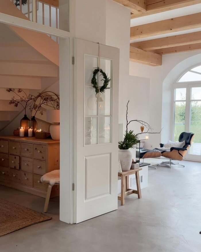 This entry plays with emptiness and light. There’s a skinny wreath on the glass door, a branch in a white vase, and a short row of candles near the stair. Wood beams overhead make the whole thing feel Scandinavian. It’s so quiet I can hear my own shoulders drop. When I tried this at home, I pulled half the knickknacks off my console. Surprise, I didn’t miss them. That is the gift of minimalist christmas decor.