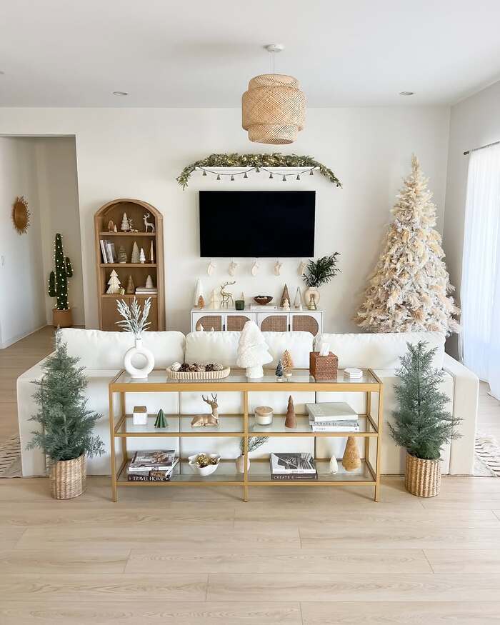 This living room builds visual warmth with tone on tone. Cream sofa, pale floors, bleached tree, and dozens of tiny tree collectibles along a console. It could be bland, but the wicker lamp shade, rattan baskets, and two small potted evergreens add texture. Texture is life in minimalist christmas decor. Instead of five bright colors, you get five natural materials. It feels rich and kind of spa like.