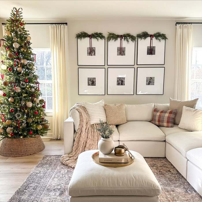 Six frames in a perfect grid hang above a sectional. Under each frame, a tiny swag of greenery ties with the same red ribbon. It’s tidy, sweet, and so easy to steal. The tall tree in a woven basket brings the vertical height while the rest of the space stays open. I like how the plaid pillow and knit throw nod to tradition without tipping into chaos. This is understated Christmas decor at its easiest.