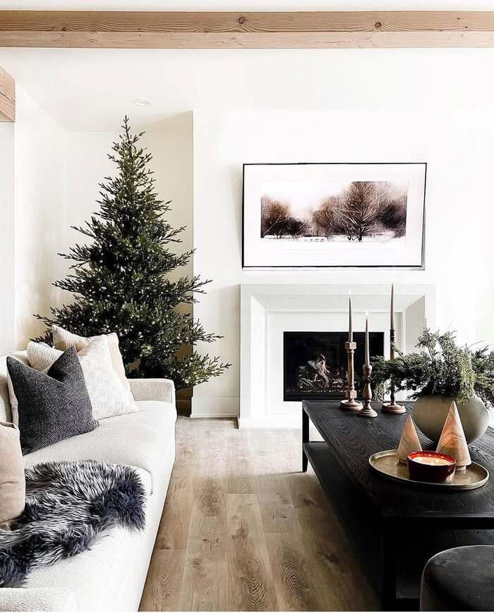 I didn’t think I’d love a nearly naked tree until I tried it. This room proves how beautiful restraint can be. The tree has warm lights and maybe a few tiny ornaments, that’s it. On the coffee table, slim candlesticks, a ceramic bowl of greenery, and one red candle for drama. The black table and white fireplace are strong shapes so the tree doesn’t need to shout. This is pure minimalist christmas decor.