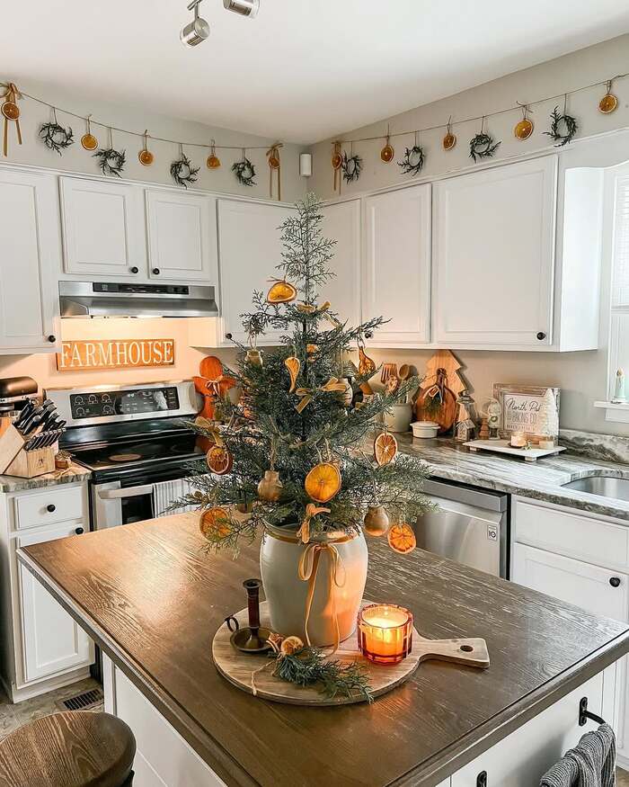 This kitchen idea won the internet at my house. A little tree sits in a crock on the island, dressed in dried orange slices and ribbon scraps. A garland of citrus and herbs trails across the cabinets. It smells like cookies even before the oven is on. It’s festive but super practical because the counters still work. That balance is the soul of minimalist christmas decor in busy rooms.