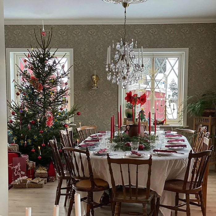 Now for a simple Scandinavian dining setup. A real tree stands by the window with small ornaments, straw stars, and little flag garland. The table carries a wreath centerpiece with bold red taper candles and a few apples. It’s humble and joyful. You can actually serve food without clearing a forest of centerpieces first. That pragmatism is why I keep chasing minimalist christmas decor for holiday meals.