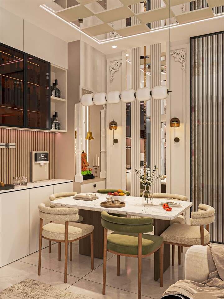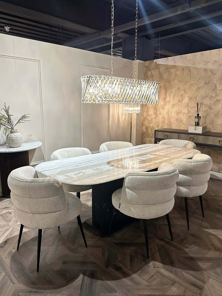 This room is a full-on statement, like it knows it’s the main character. The long marble table feels expensive and steady, and those boucle chairs look like little marshmallows you can sit on. The linear crystal chandelier above it is the star, and it throws light in a fancy way without needing extra clutter.