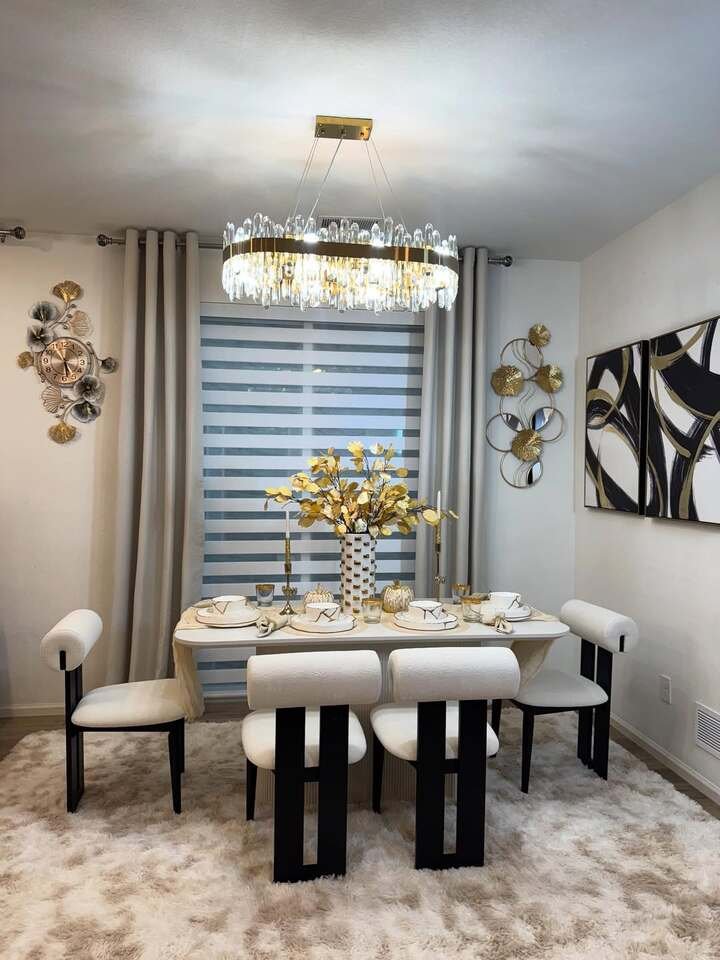 Okay, this one is a whole mood. I saved it on Instagram and literally laughed because it’s so extra, in a good way. The ceiling fixture looks like golden leaves flying across the room, and it makes the dining space feel like an event, even on a random Tuesday. Then there’s the shiny black wall with those big gold mirrors. That combo is dramatic, like fancy perfume in a bottle. It’s not for everyone, but modern dining room decor can be playful like this if you commit.