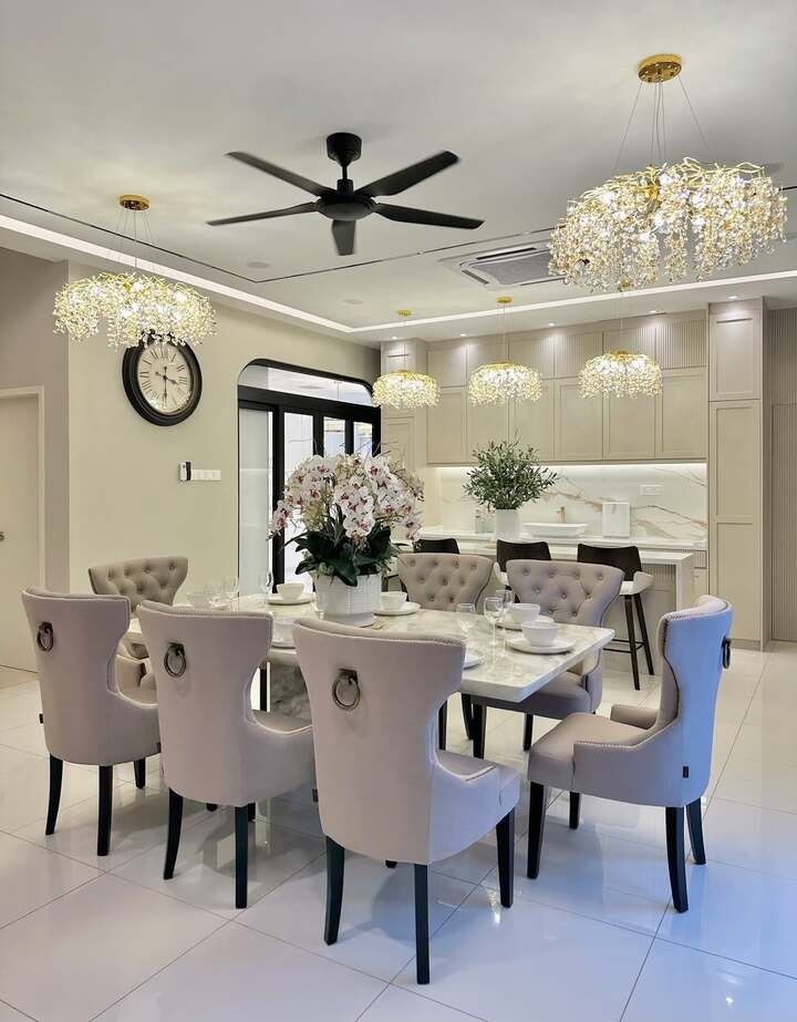 This setup is bright, airy, and honestly it feels like you could host a birthday dinner without stress. The tufted chairs give that cozy “hotel lobby” comfort, but the clean floor and light cabinets keep it modern. The crystal pendants hang like little glowing clouds, which sounds cheesy, but it works. The ceiling fan above is practical too, and I respect that because pretty rooms still need real life stuff.