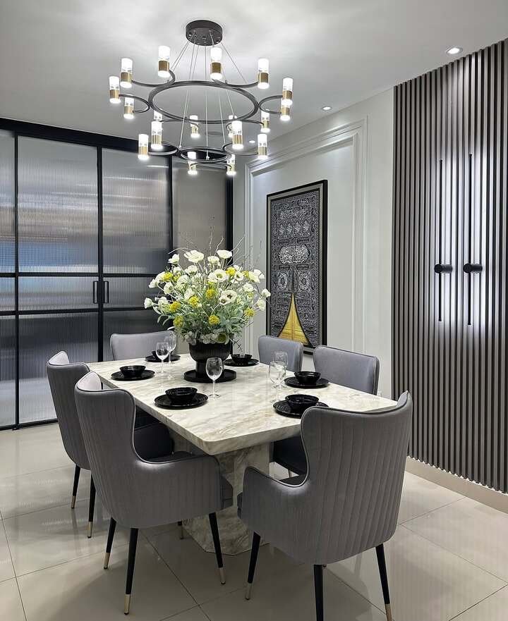 This one hits different. The ring chandelier is bold, matte, and modern, but it’s not loud. The frosted glass sliding doors add privacy while still letting light in, which is perfect if your dining room sits near the kitchen or hallway. The gray chairs look smooth and tailored, like they’re wearing nice jackets.