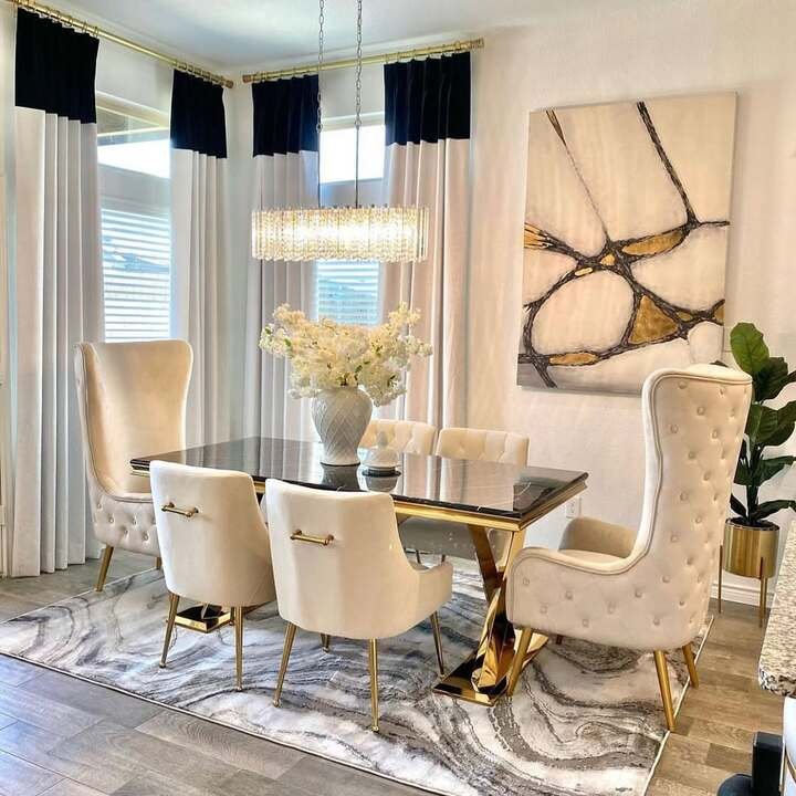 This space is glam but not overly shiny, which is hard to pull off. The black table top gives it weight, and the gold base and chair legs add that “jewelry” vibe. The chairs are cream and plush, so it still feels inviting. I also like the big curtains, they make the room feel finished, like it has a beginning and an ending.