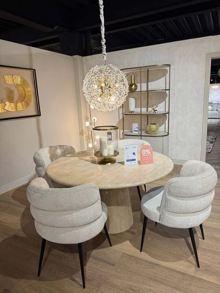 This round setup feels like conversation happens here, like people stay after dinner and talk too long. The rounded chairs are thick and soft, almost lounge-like, so it feels less formal. The crystal globe chandelier adds sparkle, but because the table is round, the whole vibe stays friendly, not stiff.