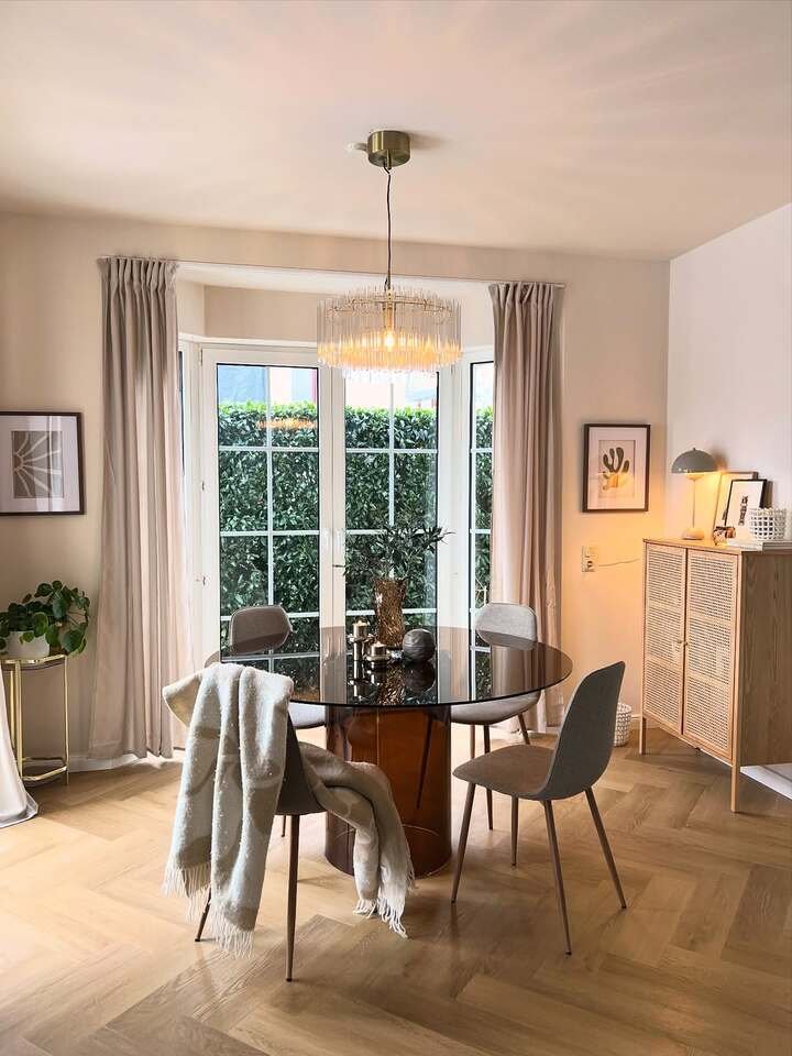 This one feels calm and real, like a normal morning coffee could happen here, not just fancy dinners. The round glass top keeps the room open, and the soft curtains make the light feel gentle. The chairs are slim and modern, so the space doesn’t feel crowded. There’s also a warm wood tone under everything that makes it feel homey.