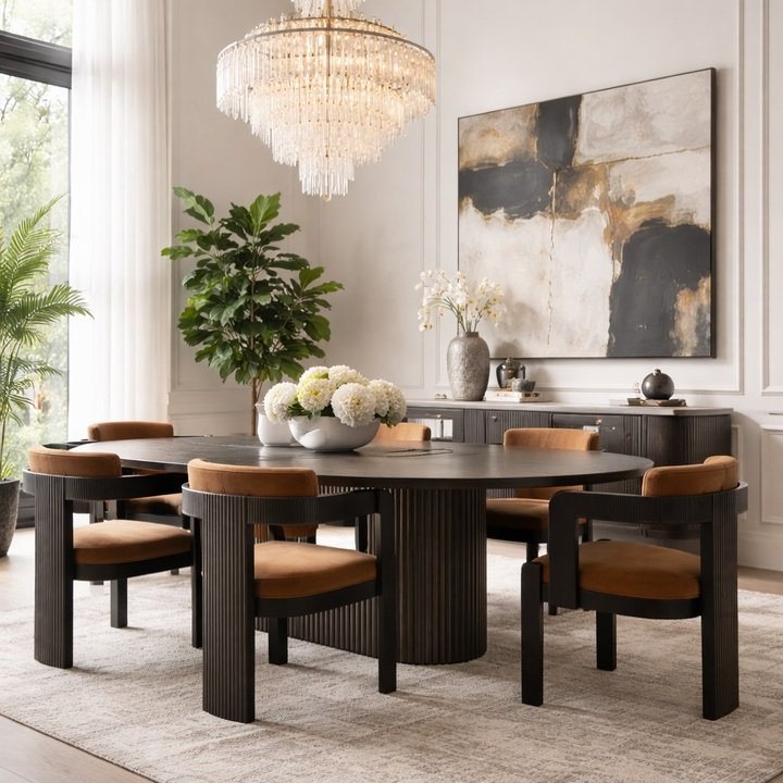 This room mixes sparkle and warmth in a way that feels super rich. The chandelier is big and dripping with crystals, but the chairs are a warm brown tone that keeps it grounded. The table is bold too, dark and solid, so it holds its own under that light. Then there’s the large abstract art, which keeps the space from feeling too traditional.