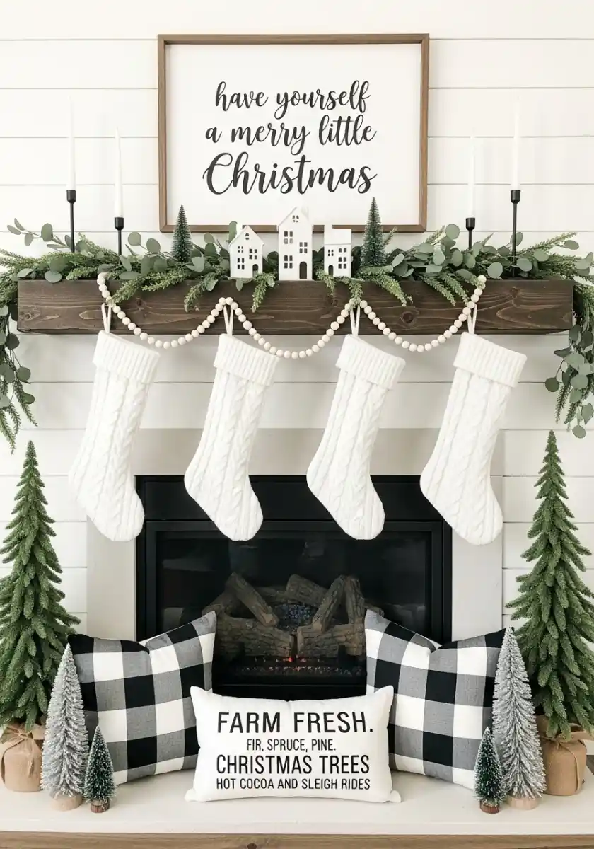 Here’s my trick list: hang stockings with clear Command hooks and hide the hooks behind a bead loop. Mix two greens, eucalyptus and fir, so it looks fuller. Add three tiny trees on the hearth for balance, not five. Keep the color story tight, white, black, greenery, a little wood. That restraint is what makes modern farmhouse Christmas decorations feel clean, not busy. If your room needs extra mood, tuck battery tea lights in the houses. They glow like real windows and kids go nuts.