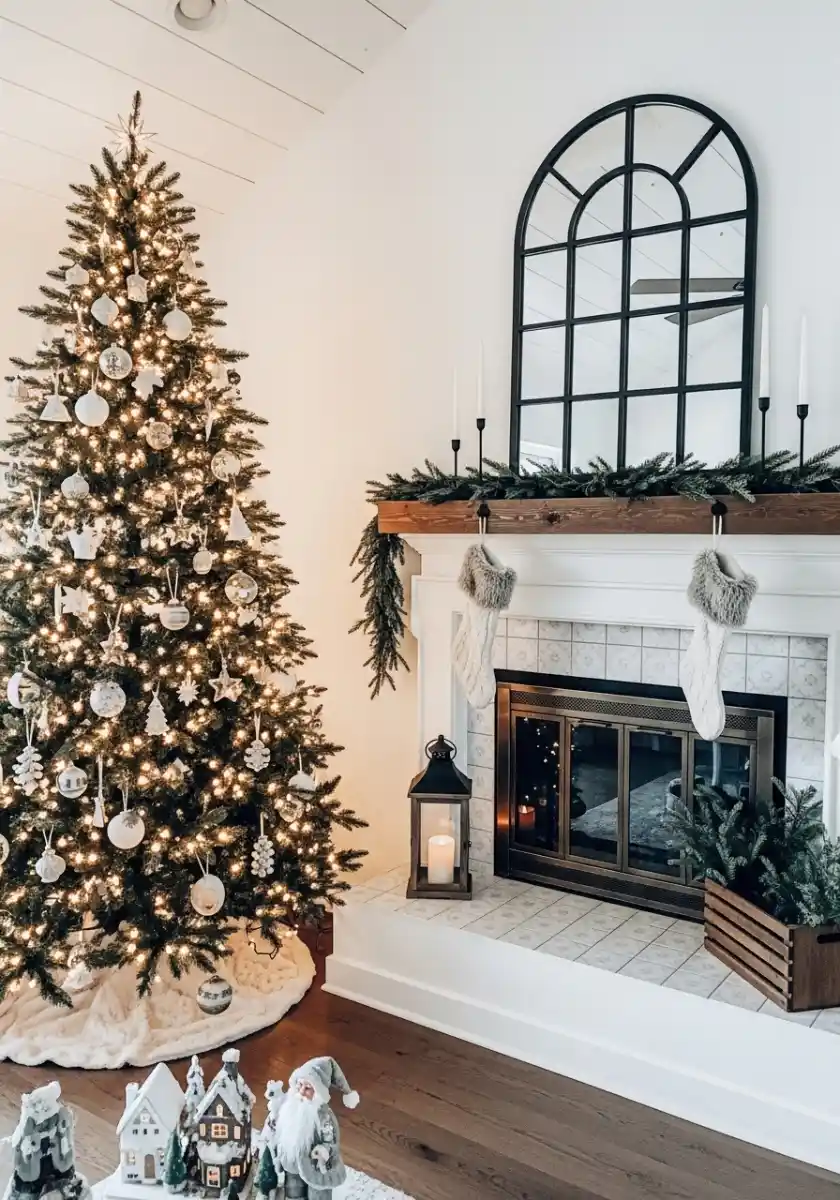 To style it at home, choose two ribbon patterns that share a color and alternate spirals down the tree. Keep ornaments simple, metallic and white, so the ribbons lead. Tile around the fireplace in a repeating black motif gives that crisp modern base under all the cozy. If full patterned tile isn’t happening, lay a black and white rug with a big grid. You still get modern farmhouse christmas decor vibes without renovation.