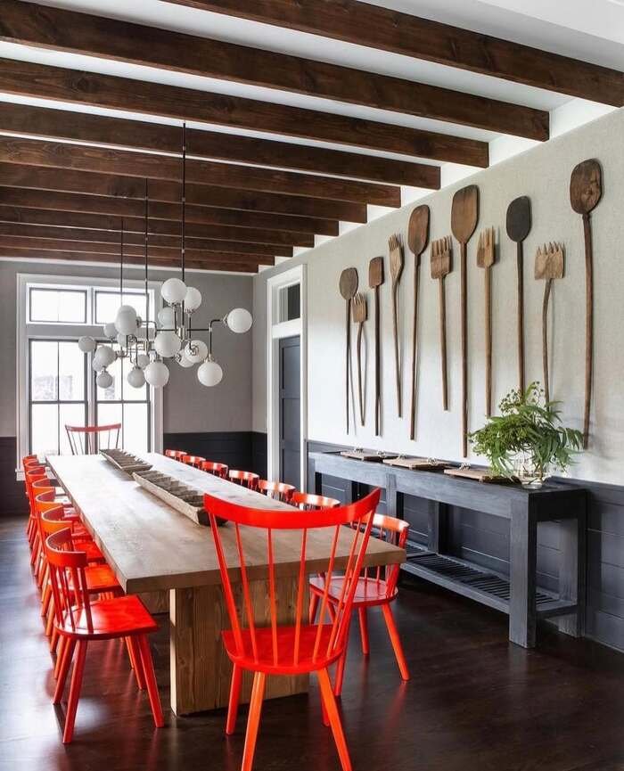 modern farmhouse dining room decor with bold red chairs and giant wall utensils