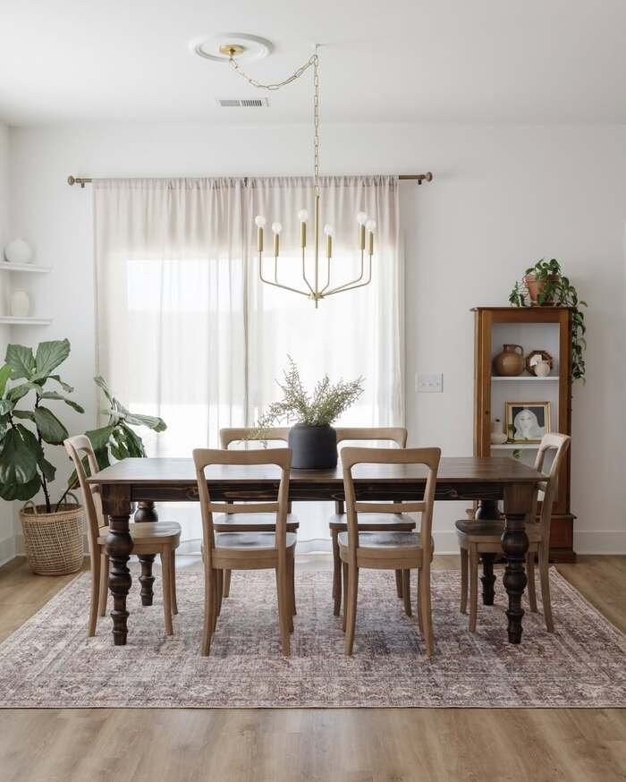 modern farmhouse dining room decor with a cozy neutral table-and-rug moment