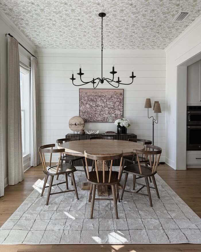 For modern farmhouse dining room decor, this is a great reminder that “farmhouse” doesn’t have to mean distressed everything. The pendant light is sculptural and soft, and it pulls your eyes up. If your ceiling is plain, a statement light gives you that wow factor without cluttering the room.