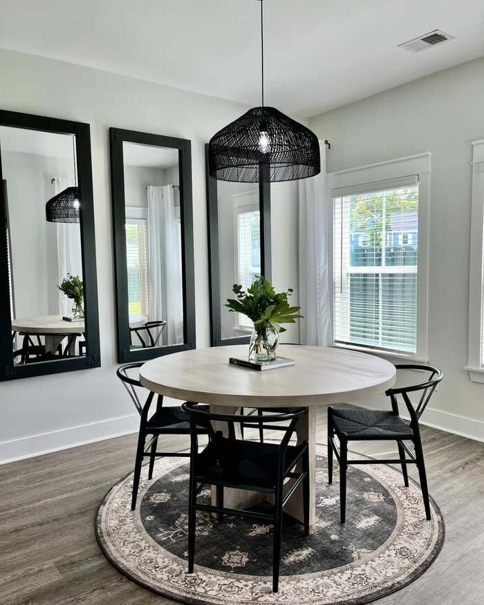 This room is simple but it feels sharp. A pale round table, black chairs, and two tall mirrors leaning on the wall. That’s such a clean combo for modern farmhouse dining room decor because it mixes farmhouse shapes with modern contrast. The black woven pendant light adds texture, and texture is everything when your colors are mostly neutral.