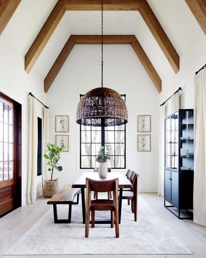 Okay this one is a dream. Tall ceiling, big beams, light walls, and that huge woven pendant hanging like a basket from heaven. This is modern farmhouse dining room decor that feels airy, not heavy. The wood table and bench bring the farmhouse, while the clean windows and simple wall art keep it modern.