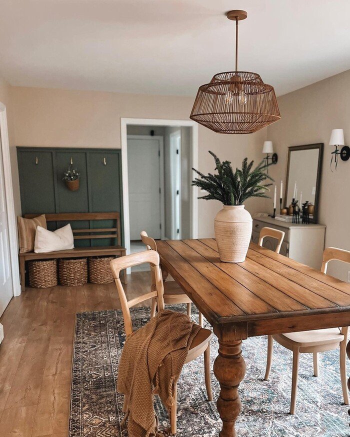 If you want this farmhouse dining room decor modern vibe, use warm wood and add one woven piece. Like a pendant, or baskets, or a jute rug. Woven texture makes everything feel softer. And please don’t over-style the table. A modern farmhouse dining table looks best when it’s not trying too hard.