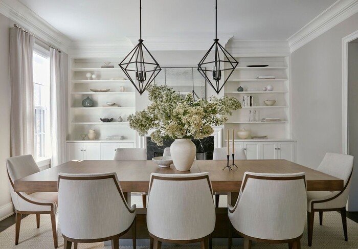 What makes it work is scale. The pendant is big, the windows are big, and the table is sized to match. If you put a tiny light in a big room, it looks sad and lost. I also like that there’s a black cabinet on the side, it adds contrast so the room doesn’t wash out into beige land.