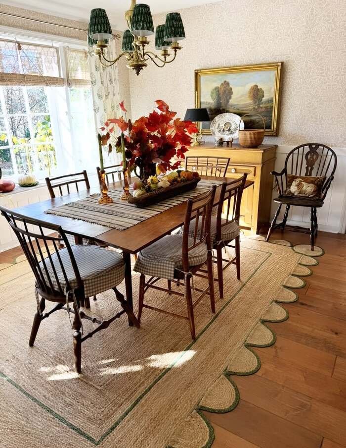 I love the texture layering too: the runner, the wood tones, and the sideboard in the background. It’s not overly modern, but it still fits because the room stays simple in layout. The decor is focused in the center of the table, and the rest of the room is calm.