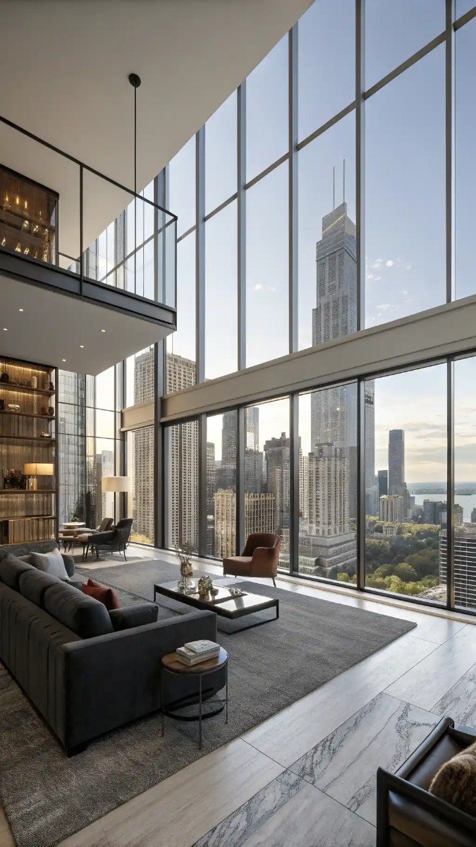 What draws me to this is the incredible integration of urban views with sophisticated interior design. The expansive windows truly define this modern high rise apartment living room, turning the cityscape into a dynamic piece of art.