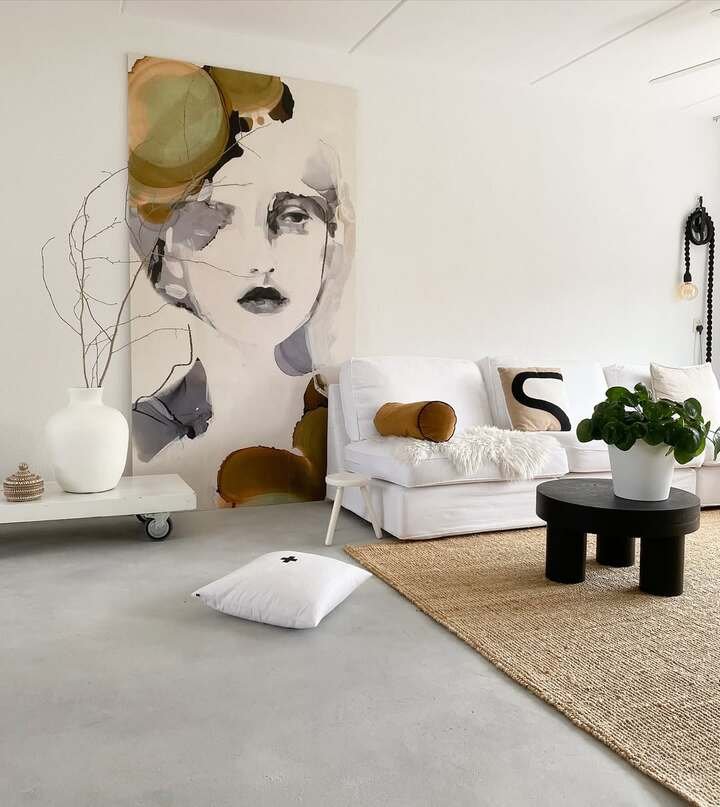 I keep dreaming about a modern minimalist living room apartment that lets one big idea carry the room. In the first space, a huge portrait leans on the wall and basically acts like a window to someone’s mood. The rest is quiet. White sofa, low cart on wheels, jute rug, and a tiny black coffee table that looks like a sculpture. When I tried this trick at home, I learned two things. One, oversized art needs breathing room. Two, if the art has warm browns like this piece, caramel accent pillows are your best friend.