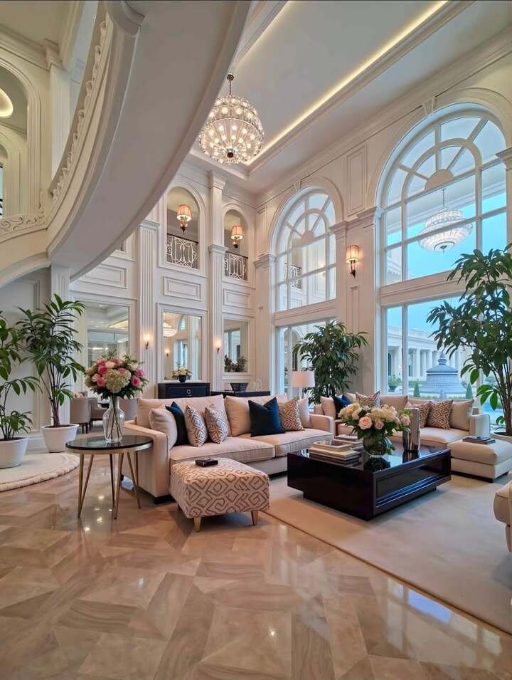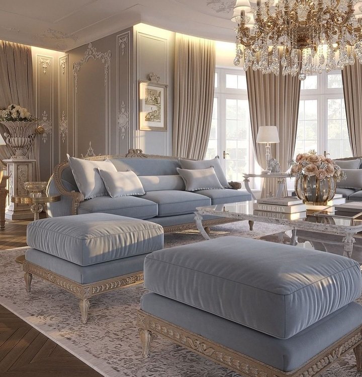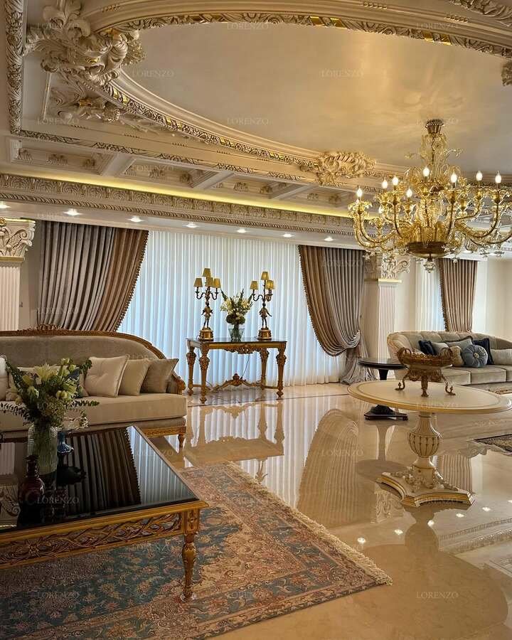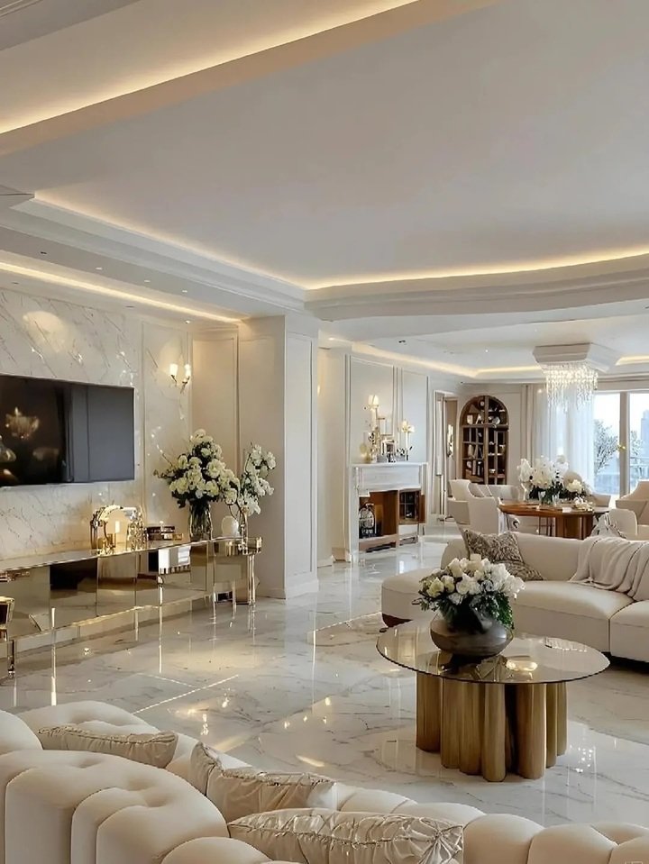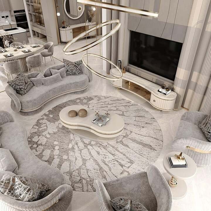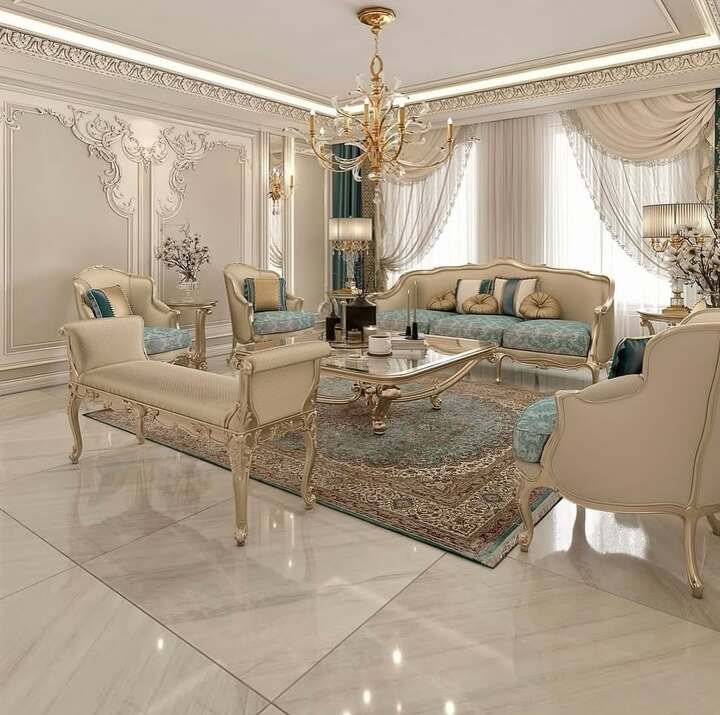 The last space is the most ornate and somehow still passes the modern minimalist apartment living room test. Yes, the ceiling is a sculpture, and the chandelier is royal. But surfaces are mostly clear, furniture legs are light, and the palette sticks to gold, cream, and soft blue. The trick here is restraint with accessories. Large rugs define each seating island and hide a very shiny floor so it doesn’t scream.