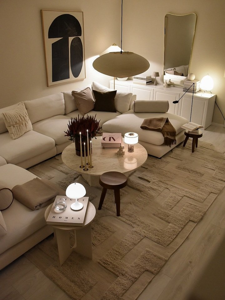 The first room pairs a cloud-like sectional with layered lighting and a sculptural rug. It’s the kind of minimalist living room that whispers instead of shouts. What makes it work is contrast in texture, not color. Nubby pillows, a ribbed pendant, a travertine coffee table, and a plush geometric rug keep the palette creamy without feeling flat. If your modern minimalist living room apartment feels sterile, add a single deep accent like chocolate pillows or a soft camel throw. It grounds the light upholstery.