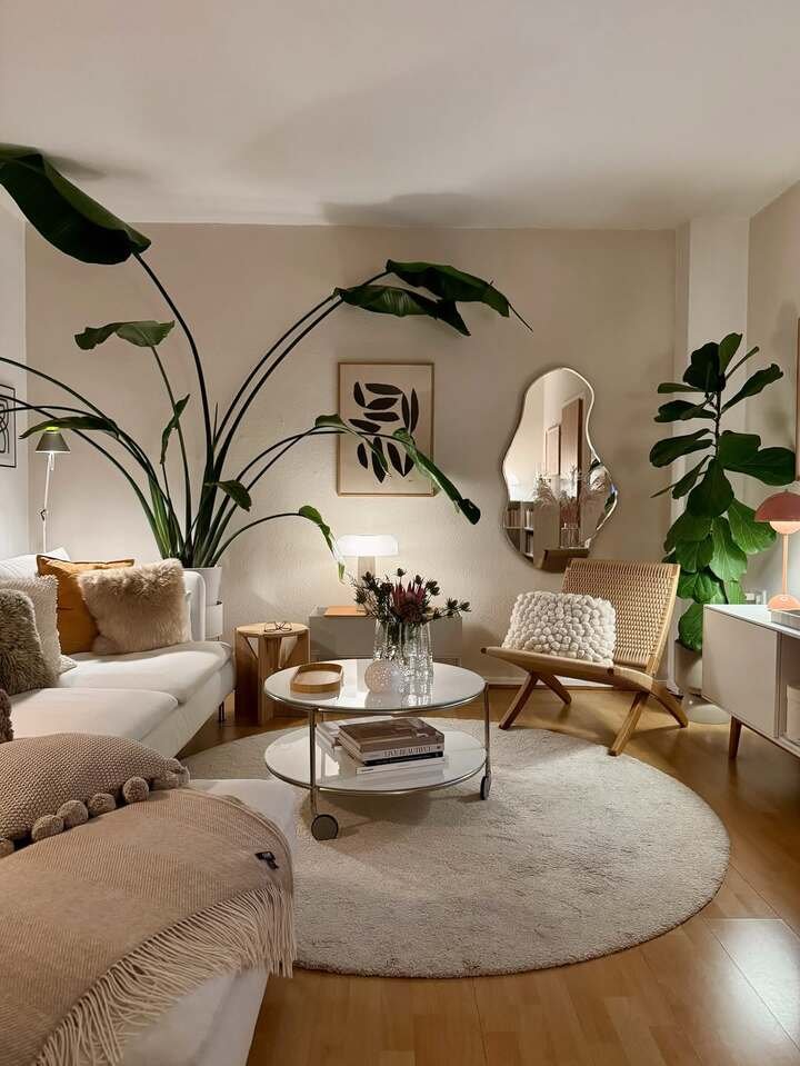 This one leans nature-forward. Two large plants frame a curved mirror, with a circular rug and a rolling coffee table keeping things playful. It’s still a modern minimalist living room, just friendlier. If you’re scared of plant chaos, choose one giant statement plant and one sidekick. Big leaves act like artwork and make ceilings read taller. I keep a simple watering calendar on my fridge because the easiest way to ruin a minimalist living room is a droopy fiddle leaf.