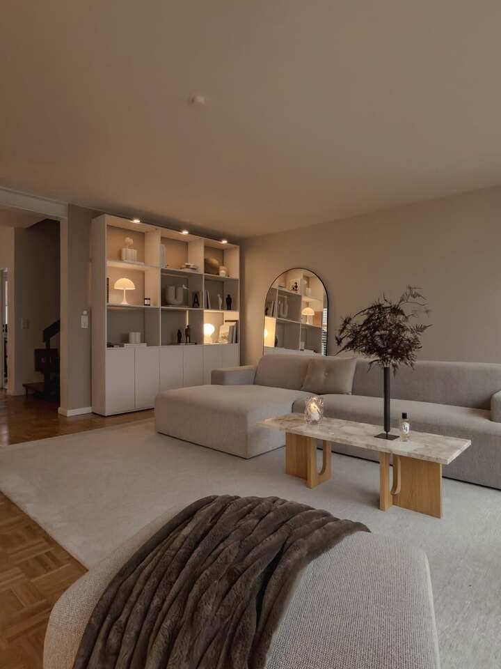 Modern minimalist living room apartment with warm neutrals