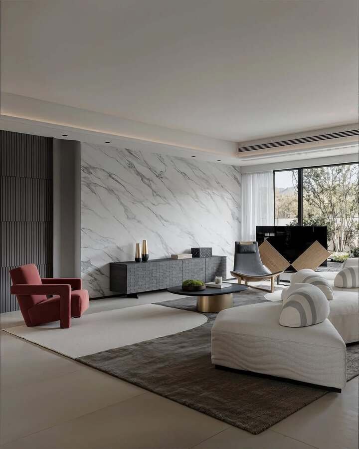 Modern minimalist living room apartment with a marble statement wall