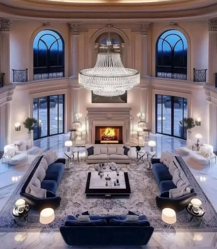 Ok, this one is not “minimal” by square footage, but the lesson still slaps. Blue velvet sofas wrap a massive rug, a fireplace anchors the room, and the chandelier is a comet. Why include it? It proves scale is everything. Even in a small minimalist living room, a larger rug and one strong focal piece will make the room feel intentional. Tiny items everywhere scream dorm room. One big piece says grown up.