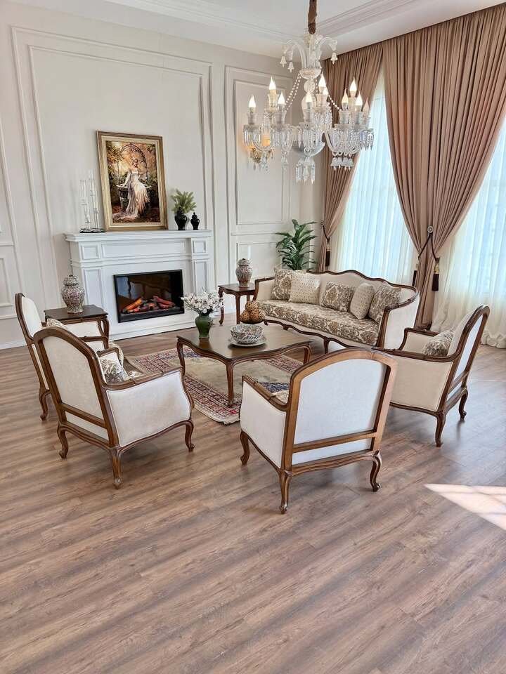 This is the classic salon look: crystal chandelier, soft drapery, carved fireplace, and wood frames. Still, the layout is simple and breathable. The magic is the air between chairs. In a minimalist living room, spacing is a design tool. You want pathways where your feet naturally want to go. I once shoved everything against the walls and wondered why the room felt like a waiting room. Floating the sofa and chairs around a small rug brought conversation back to the center.