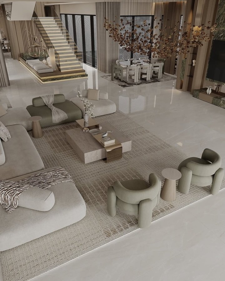 This room is a masterclass in form. Low modular sofas meet two chunky olive armchairs that look like friendly robots. Neutral woven rugs stack under a stone table with a brushed metal accent. It’s minimalist, yes, but joyful. When shapes are the star, stick to a calm palette. The creamy upholstery lets those playful chairs feel intentional, not cartoonish.