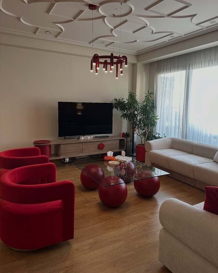 I know, red can be scary. But the red chairs and round red coffee table bases here are confident, not loud. The rest of the room stays neutral: beige sofa, wood floor, clear glass. The trick is choosing one red and sticking to it. When I tried mixing cherry, cranberry, and tomato, my living room looked like a fruit basket. One shade only. Two or three pieces max.