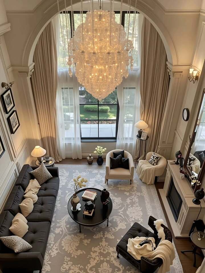 This second space is grand, but the rules still fit any modern minimalist living room apartment. The chandelier steals the show and fills the tall air. Everything else is low, dark, and simple. The sofas are tufted charcoal, the rug is pale with a soft floral, and round tables repeat the shape of the light. If you live in a rental, you can copy the feeling without rewiring. Try a big floor lamp with a drum shade and place it where it creates a halo across the ceiling.