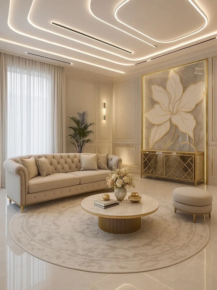 The final room is pure calm. Beige sofa, round ottoman, circular rug, and a wall panel with floral relief. The ceiling has gentle LED lines that add motion without clutter. For a minimal living room apartment, lights like these act as jewelry. You don’t need art everywhere when the ceiling is interesting. Keep it warm white, not cool, or you’ll feel like you’re in a clinic.