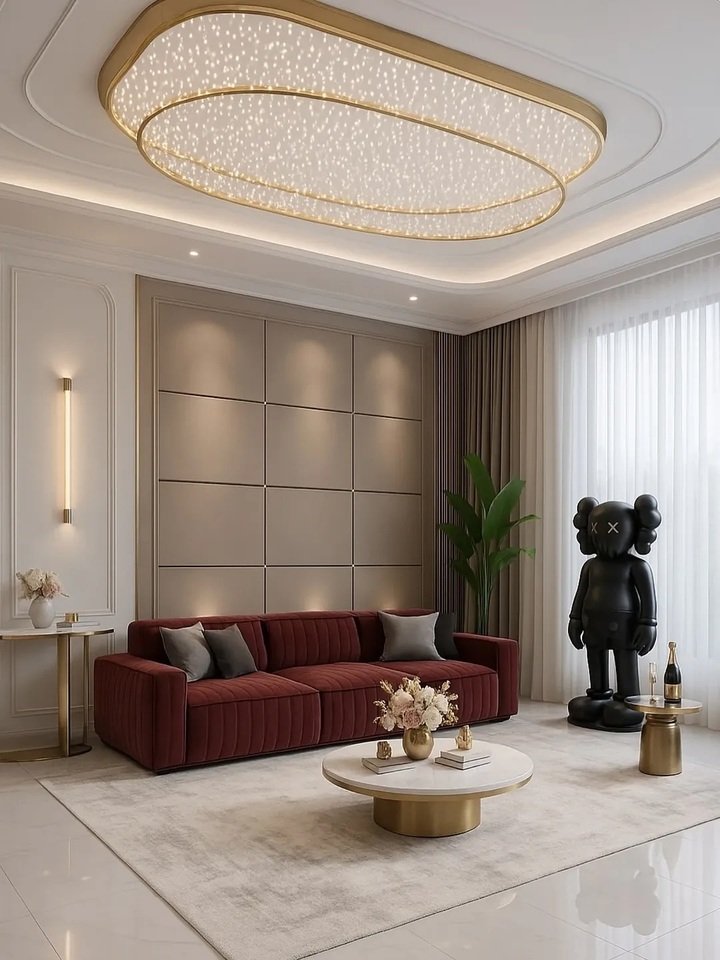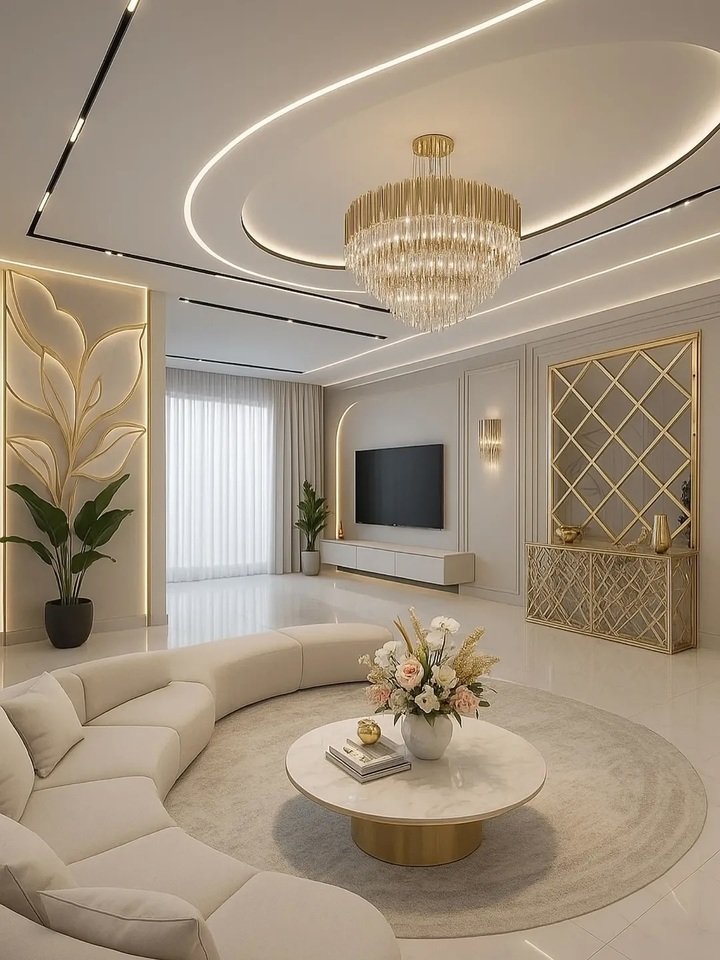 Modern minimalist living room apartment: curves, gold glow, and a ceiling that smiles