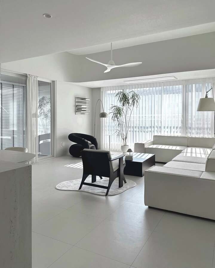 This room proves you can do almost nothing and still have something. Everything is white or warm gray, and then boom, a single black chair and a black coffee table anchor the view. Sunlight washes through sheer curtains and turns the floor into a soft light box. If you’re chasing that fresh air feeling in a minimalist modern living room apartment, paint ceilings the same shade as walls. It removes lines and makes the space float.