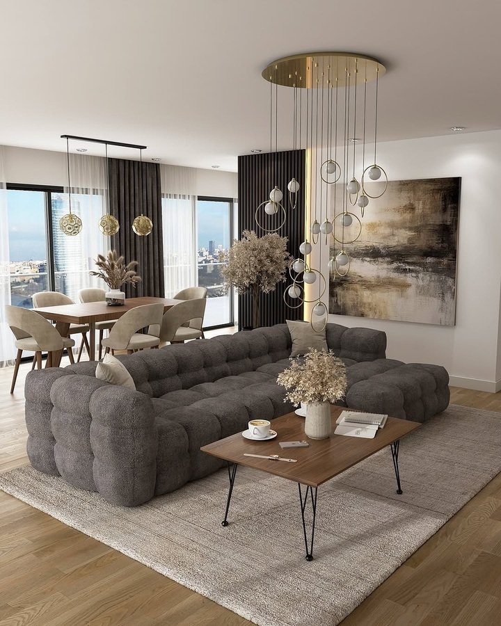 This one screams airy city life in the best way. Floor to ceiling windows, layered ceiling lights, and lots of pale furnishings keep the mood bright. The marble table tops repeat from the dining area to the living zone which makes the whole open plan feel united. In a modern minimalist living room apartment, repeating one material across zones is my favorite hack for cohesion. It’s like a chorus you keep humming while the verses change.