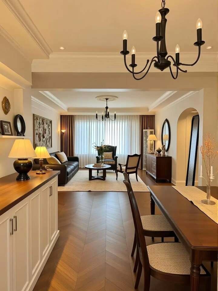 This layout is basically a hallway pretending to be a living room, and it nails it. The dining table hugs one wall, leaving a clear path to the seating zone. In any minimalist modern living room apartment that’s long and narrow, keeping a runway solves the cramped feeling. Matching chandeliers repeat down the line, which guides the eye forward.