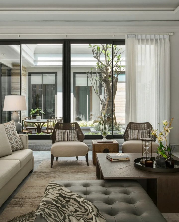 Last one, and it’s my favorite for real life. This room looks peaceful because it borrows calm from outside. Floor to ceiling glass frames a small tree and rattan chairs echo the natural textures. The palette is oatmeal, soft gray, and light wood. Nothing fights the view. That’s the smartest budget trick for a modern minimalist living room apartment. Let daylight be the art.