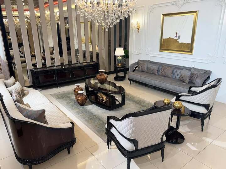 The first new room mixes classic bones with high shine: a crystal chandelier, paneled walls, and black lacquer furniture with soft gray upholstery. It’s elegant without feeling fussy, and I’m into how the glass coffee table keeps the center open so the chandelier can sparkle. In a modern minimalist living room apartment, glossy finishes can quickly look heavy, so the trick here is pairing shine with pale textiles and a slim rug. Notice the gentle curve of the sofas and chairs. Curves soften all the reflective surfaces and stop the room from feeling like a jewelry box.