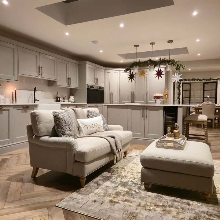 Last room is proof that small can be sweet. A cozy loveseat and ottoman sit right in the kitchen’s pocket, with herringbone floors pulling both spaces together. Cabinets are a calm greige and the lighting is layered, from recessed spots to pendant stars. In a minimal living room apartment, this kind of micro lounge is gold. It gives guests a spot to chat while you cook and keeps evening routines flexible. I’ve fallen asleep on an ottoman like this more than once and honestly no regrets.