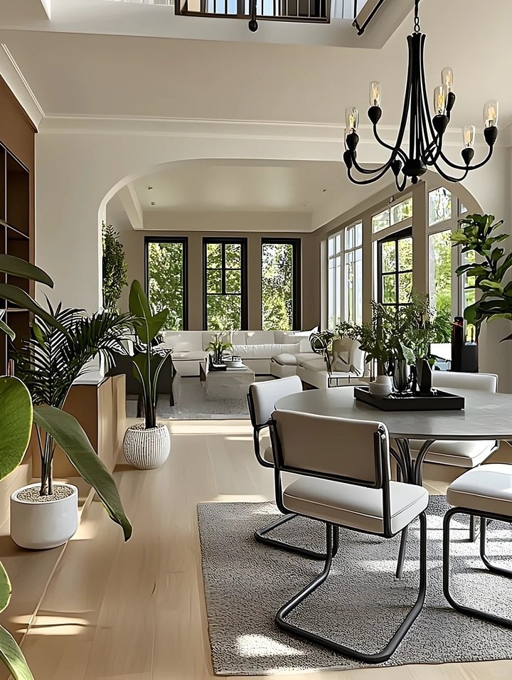 The third room shows how classical bones can meet a modern minimalist apartment living room. The arched windows and trim are fancy, but the furniture is straight and low. The couches are cream with navy pillows, and the floors shine like a marble cheesecake. Plants pop up everywhere, but they are all green, not red, not variegated, just green. That consistency keeps the space from feeling like a garden store.