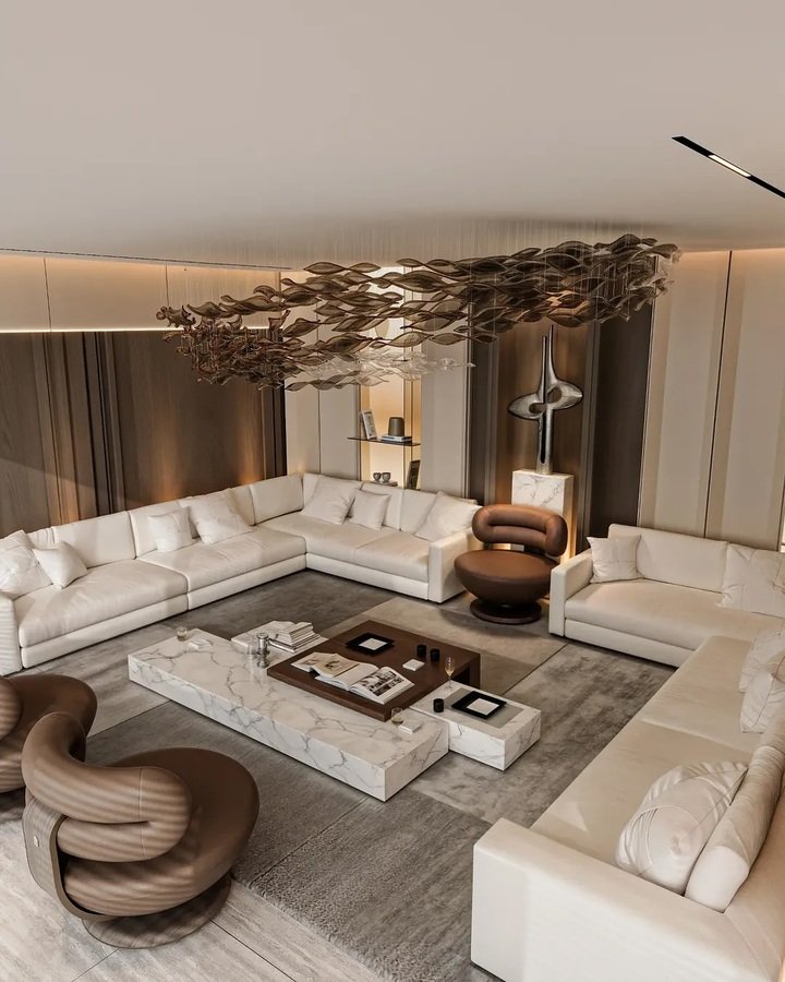 The sixth image could be a movie set. Low white sectionals wrap the room, marble plinth tables sit like ice cubes, and those brown swivel chairs look like cinnamon rolls. A metal art piece floats on the ceiling like leaves in a stream. It’s all very calm, but not stiff. The key for any modern minimalist living room apartment is height control. Nothing tall except the artwork, which keeps the view open.