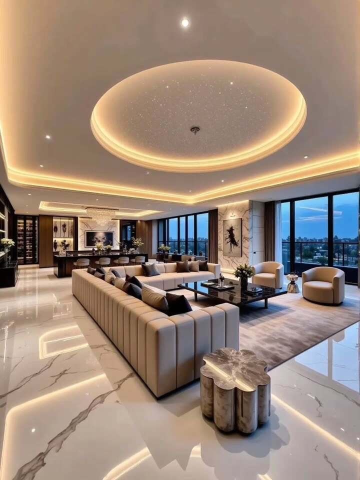 This room is my soft spot, because it proves a modern minimalist living room apartment can flirt with glam without going overboard. The creamy circular sofa hugs a round rug, and the marble coffee table repeats that soft shape with a tiny gold base. I’m a sucker for circles because they calm the eye. No sharp turns, no stress. The ceiling echoes the rug with glowing rings, so the whole plan feels like ripples in a pond. Even the built-in leaf panel on the left is quiet, not fussy, since the lines are large and simple.