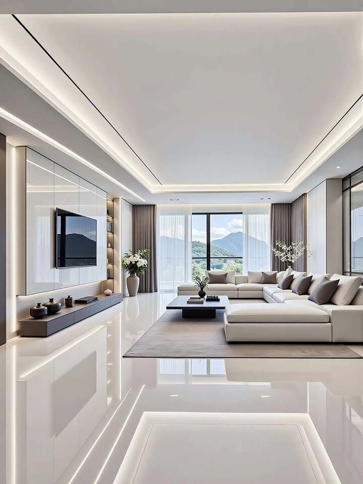 The eighth space is the most literal modern minimalist living room apartment idea in this set. White floors and white walls reflect everything, the sofa is an L shape with neat piping, and the TV hides above a slim floating console. If you live in a place with a view, keep your color story soft so the outside does the heavy lifting. Gray drapes frame the window like a curtain on a stage.