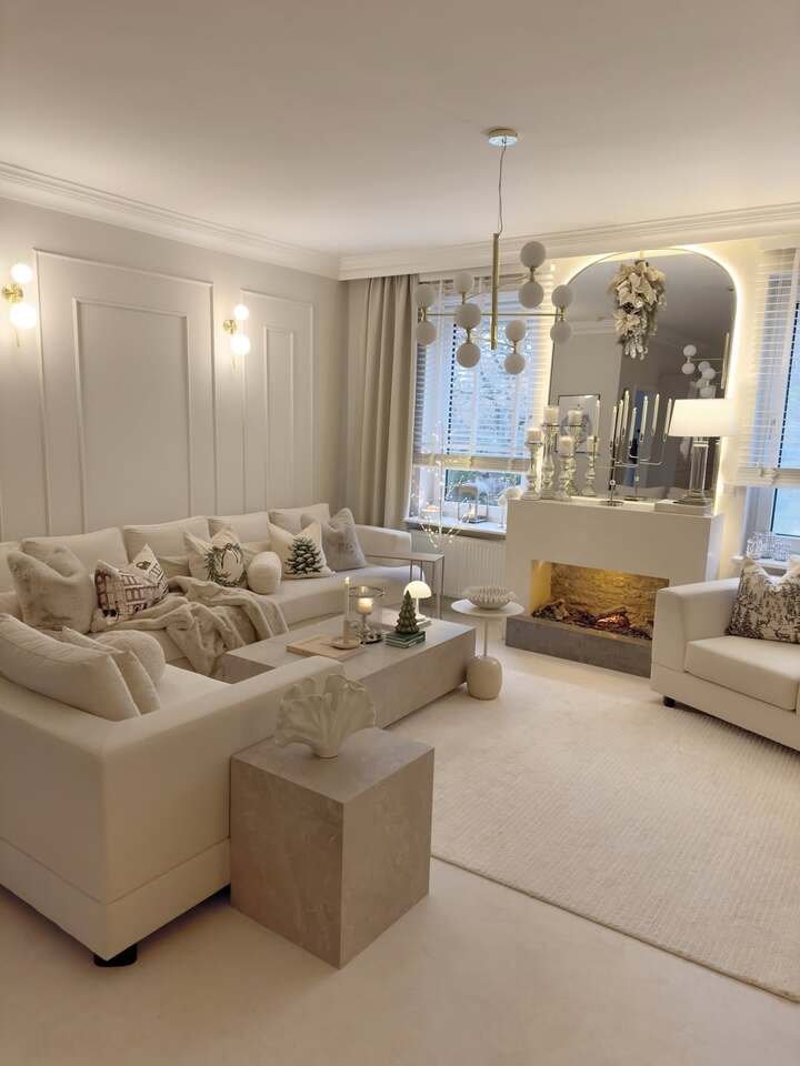 Room nine looks like it smells like vanilla. Everything is cream. The fireplace is small and linear, and there are tiny holiday decorations that somehow don’t clutter. I’m a sucker for spaces that whisper, not yell. In a modern minimalist living room apartment, cream on cream works if you layer textures. Nubby pillows, velvet throw, smooth stone side table, and a wool rug. That mix keeps the eye busy in a good way.